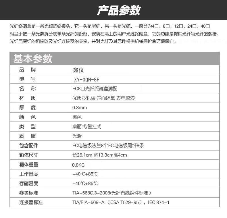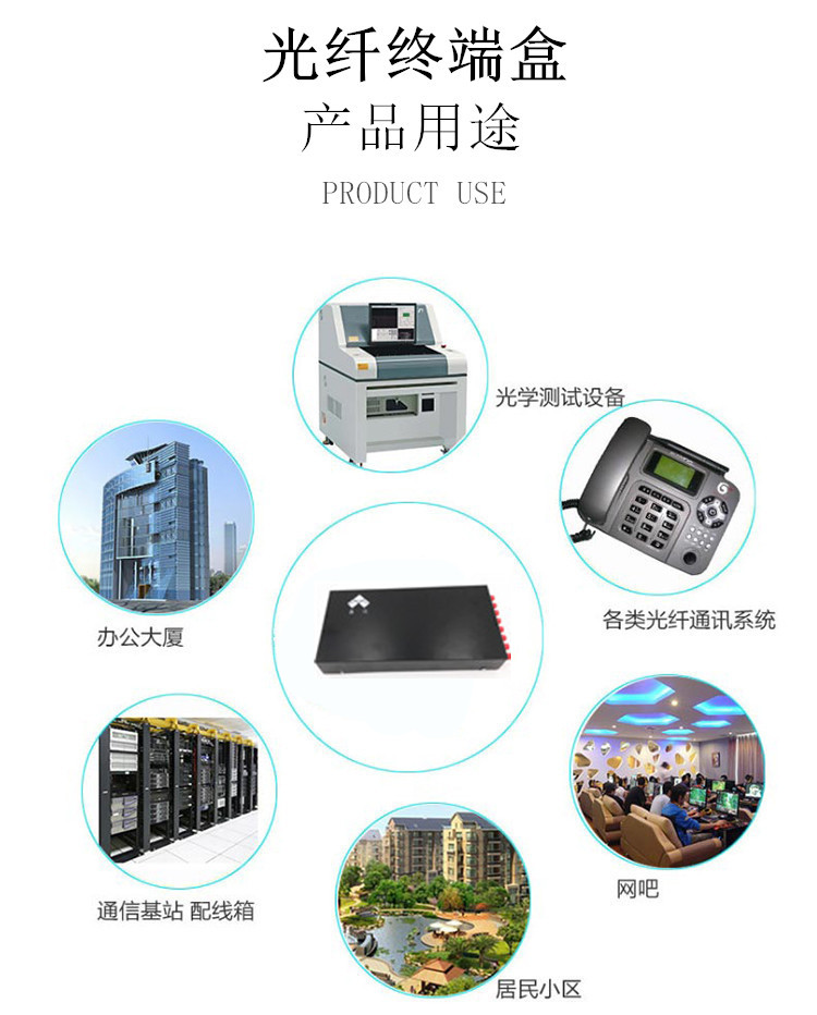 光纤终端盒是一条光缆的终接头,它-头是尾纤,另一头是光缆,-般分为4口、8口、12口、24口、 48口